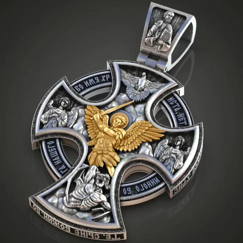 Engraved 925K Sterling Silver Necklace Michael Archangel and Crucifixion Front and Back