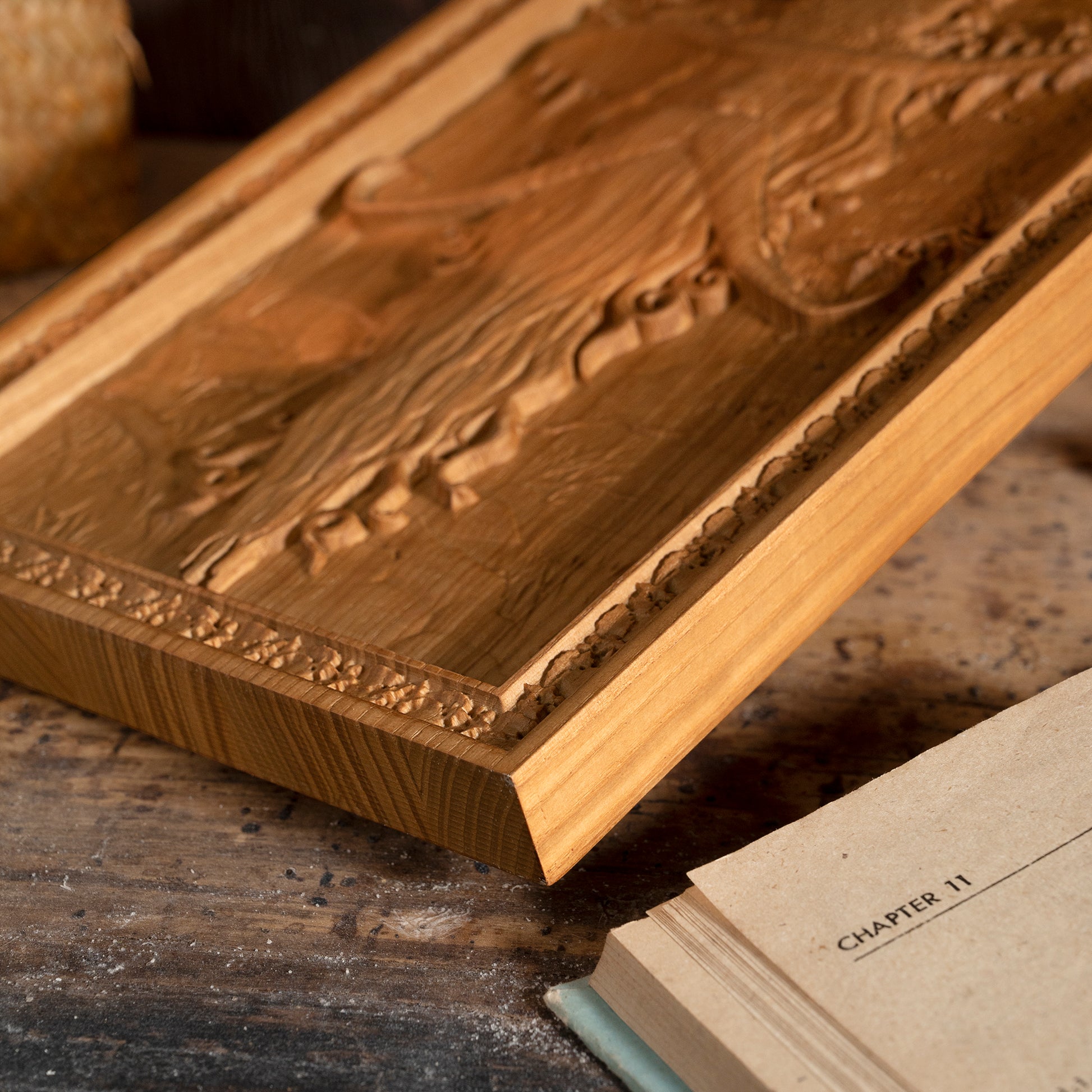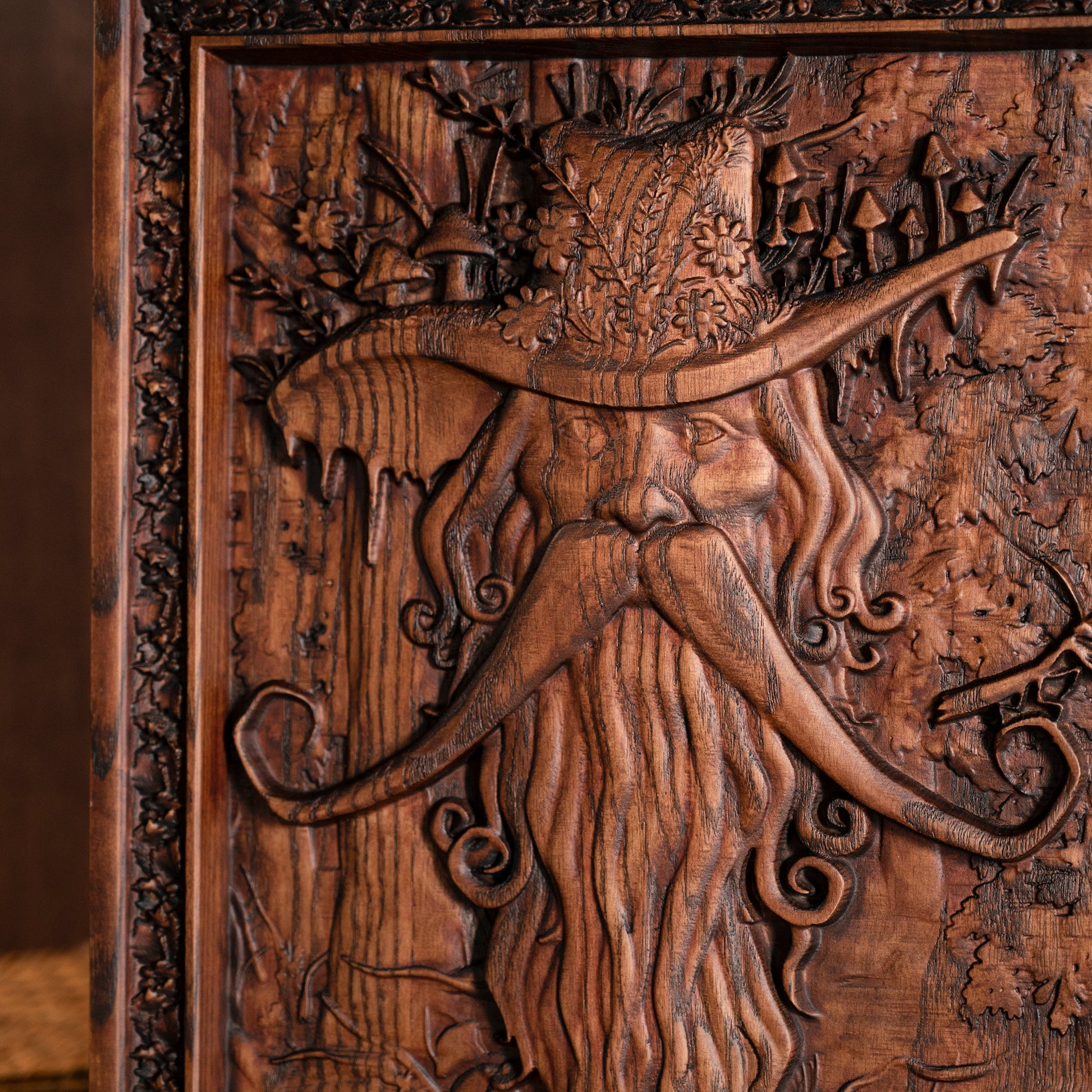 Hand-Carved Detail: Intricate wood relief with natural textures and deep carving, perfect for lovers of mythology and nature.