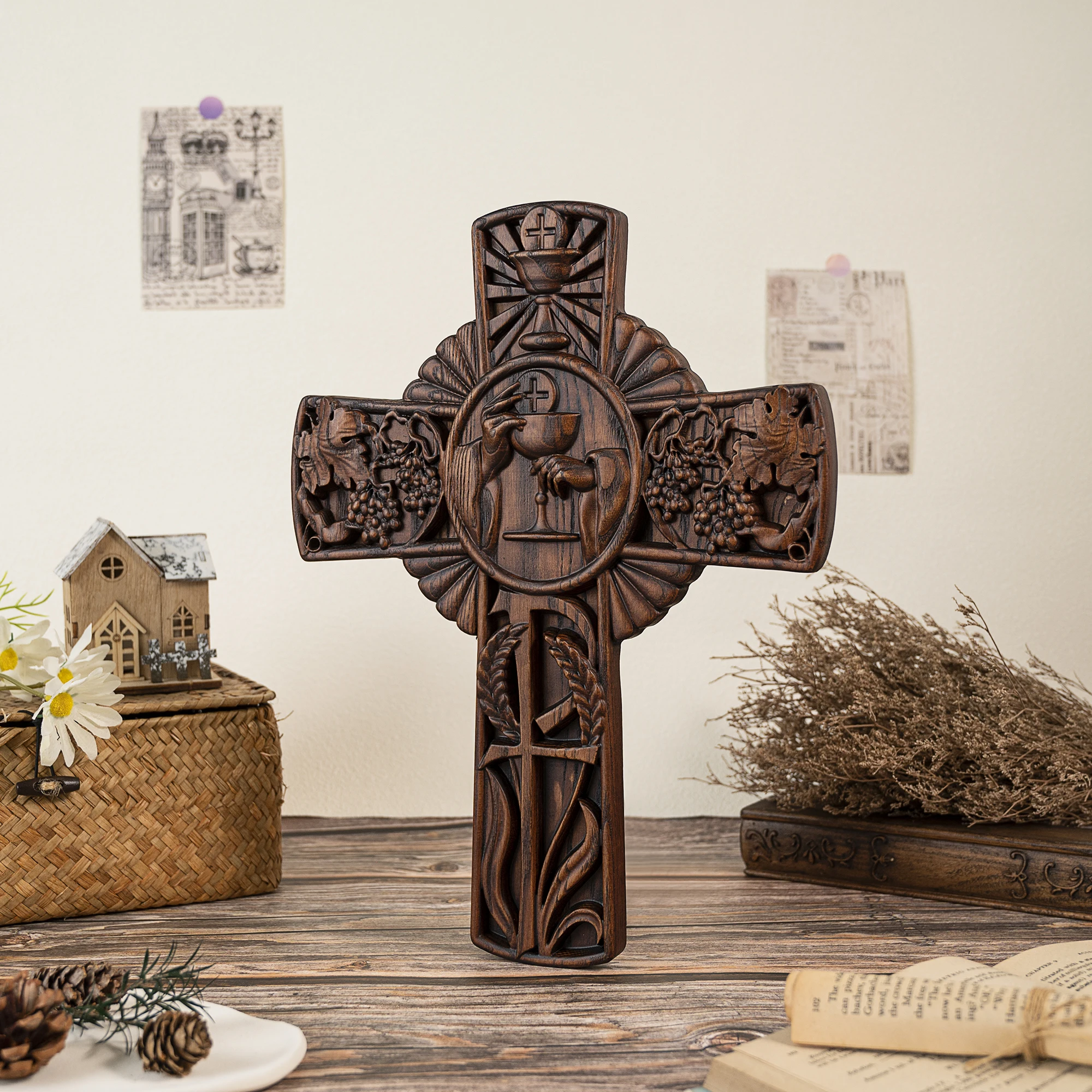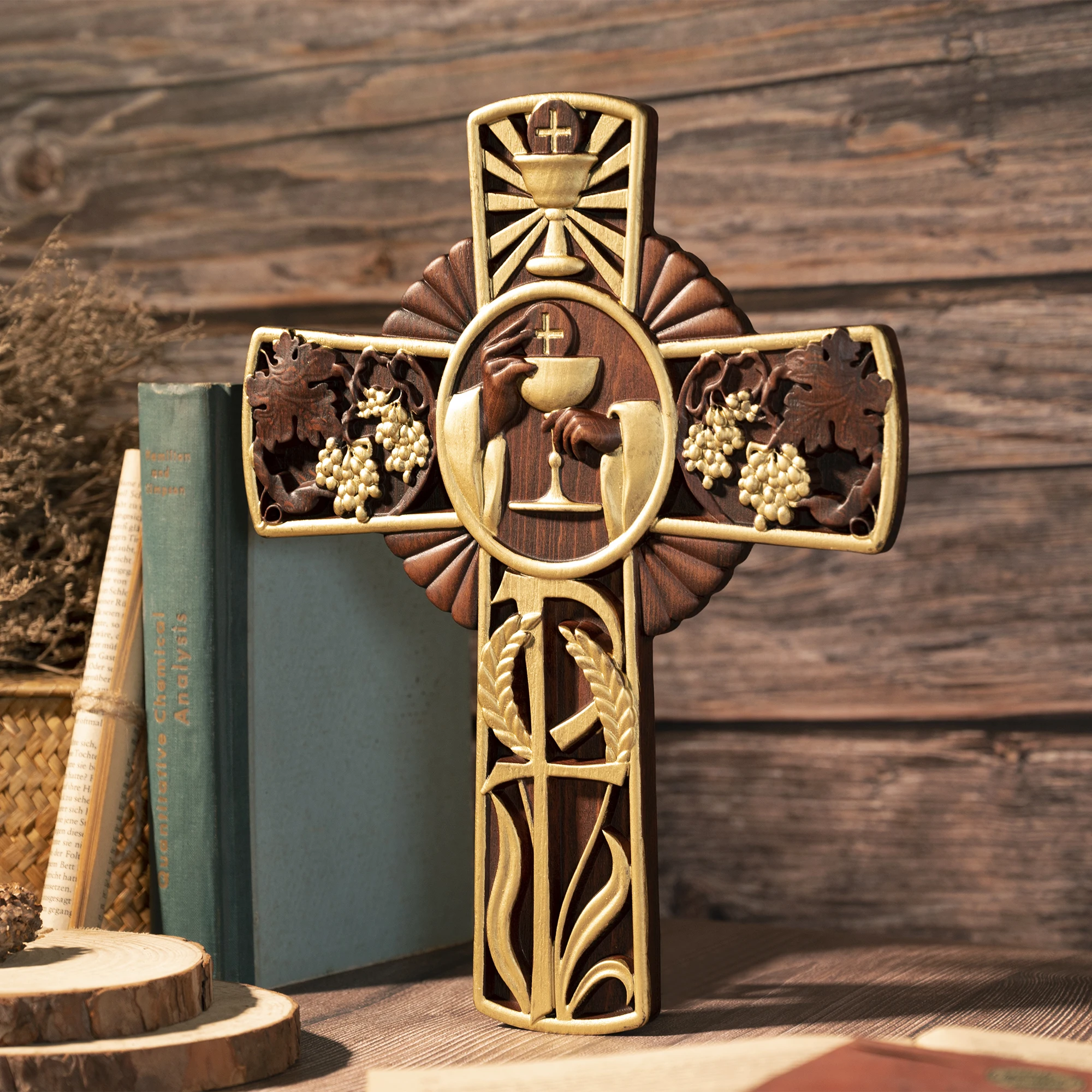Celebrate the sacred mystery of the Eucharist with this exquisitely hand-carved Holy Communion Cross. Crafted from premium natural wood and accented with elegant golden highlights, this wall cross features powerful Christian symbols: